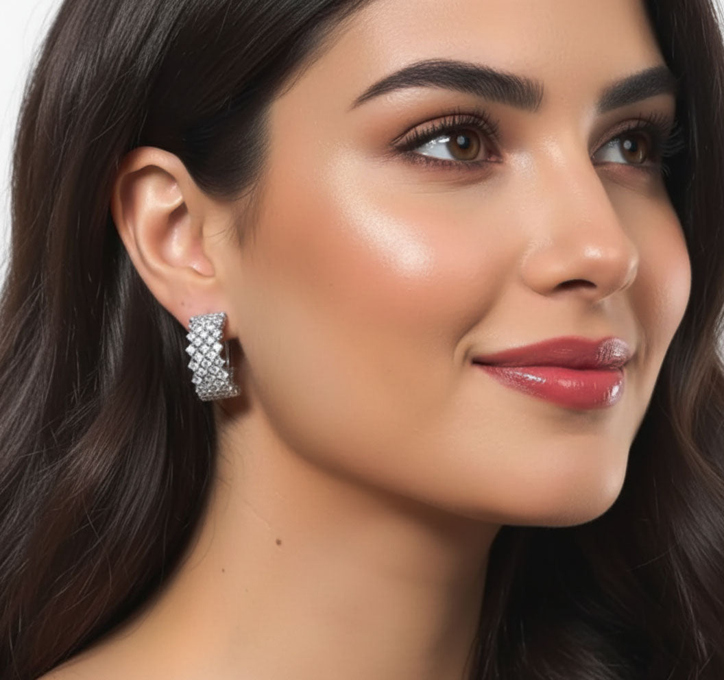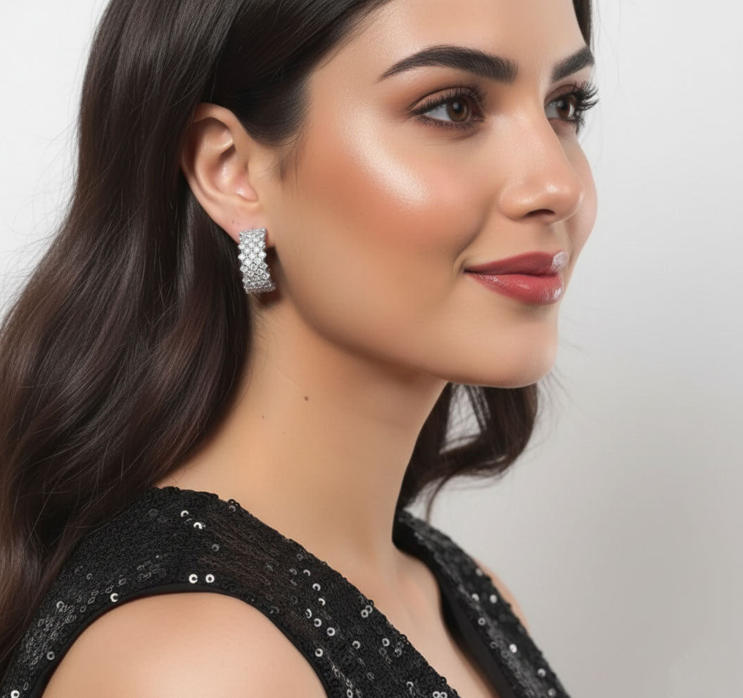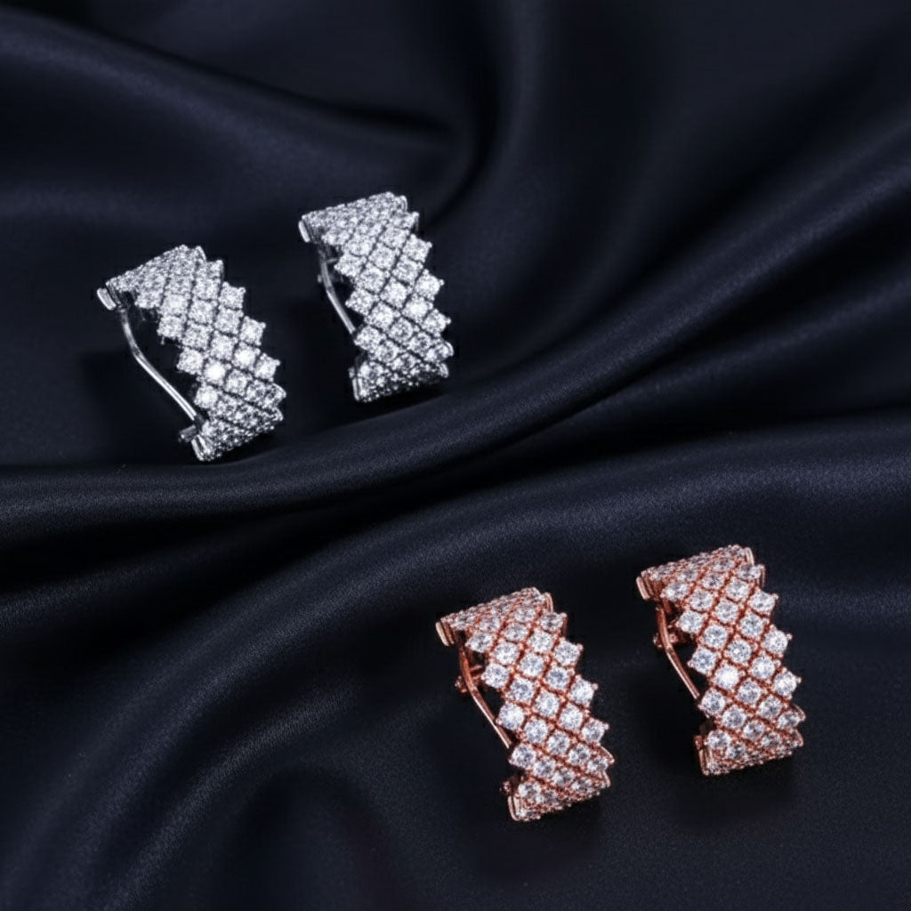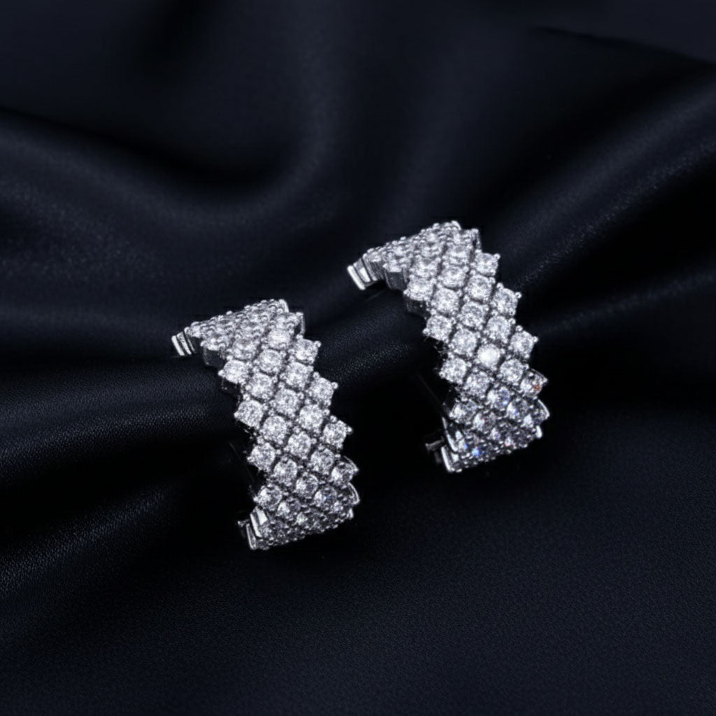 Half hoop stud earrings feature shiny AAA cubic zirconia stones, with a round brilliant cut and claw setting,
