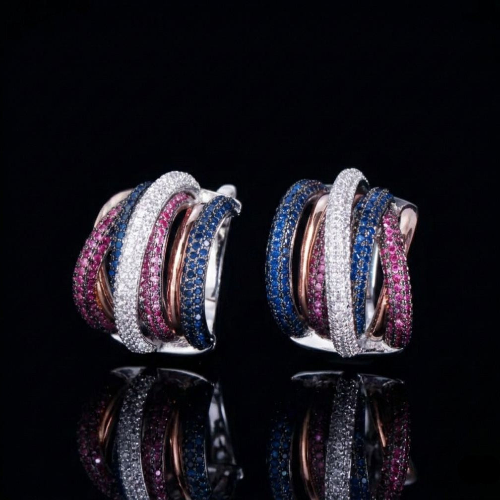 Plated in 3-tone gold, rose gold, and rhodium finishes, offering versatility with sparkling ruby and sapphire zirconia
