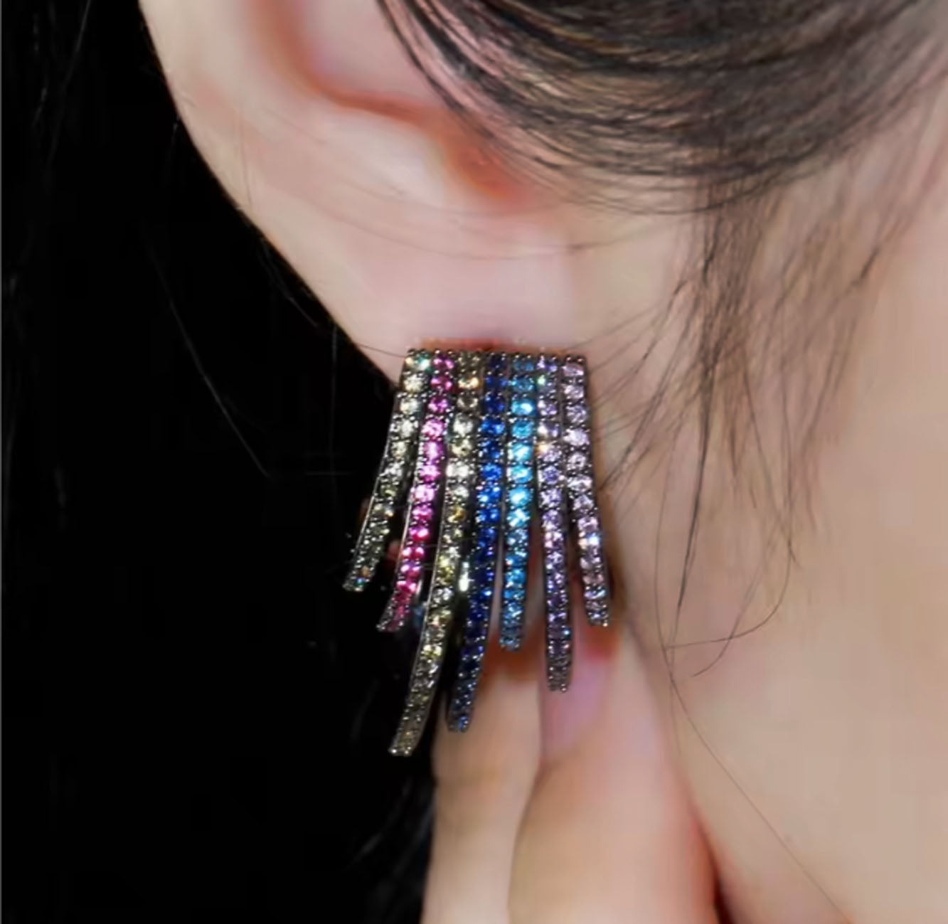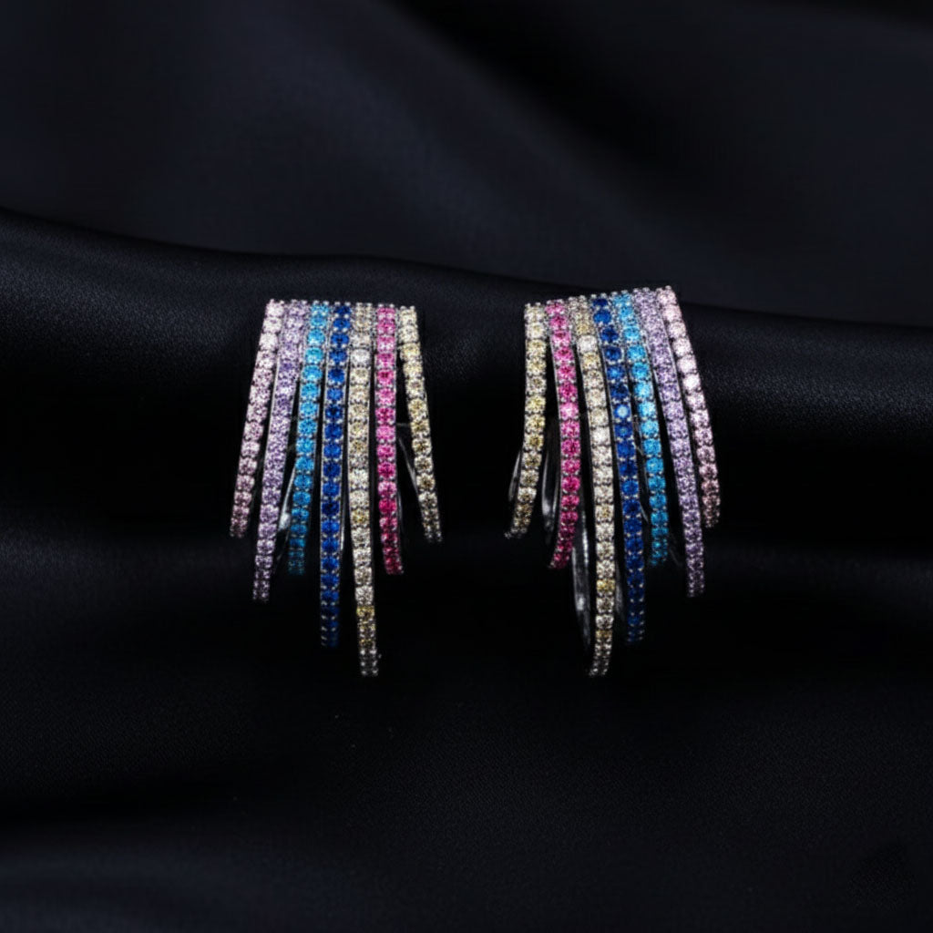 Trendy hoop earrings feature a geometric half-round design with multicolor rainbow micro pave stones.