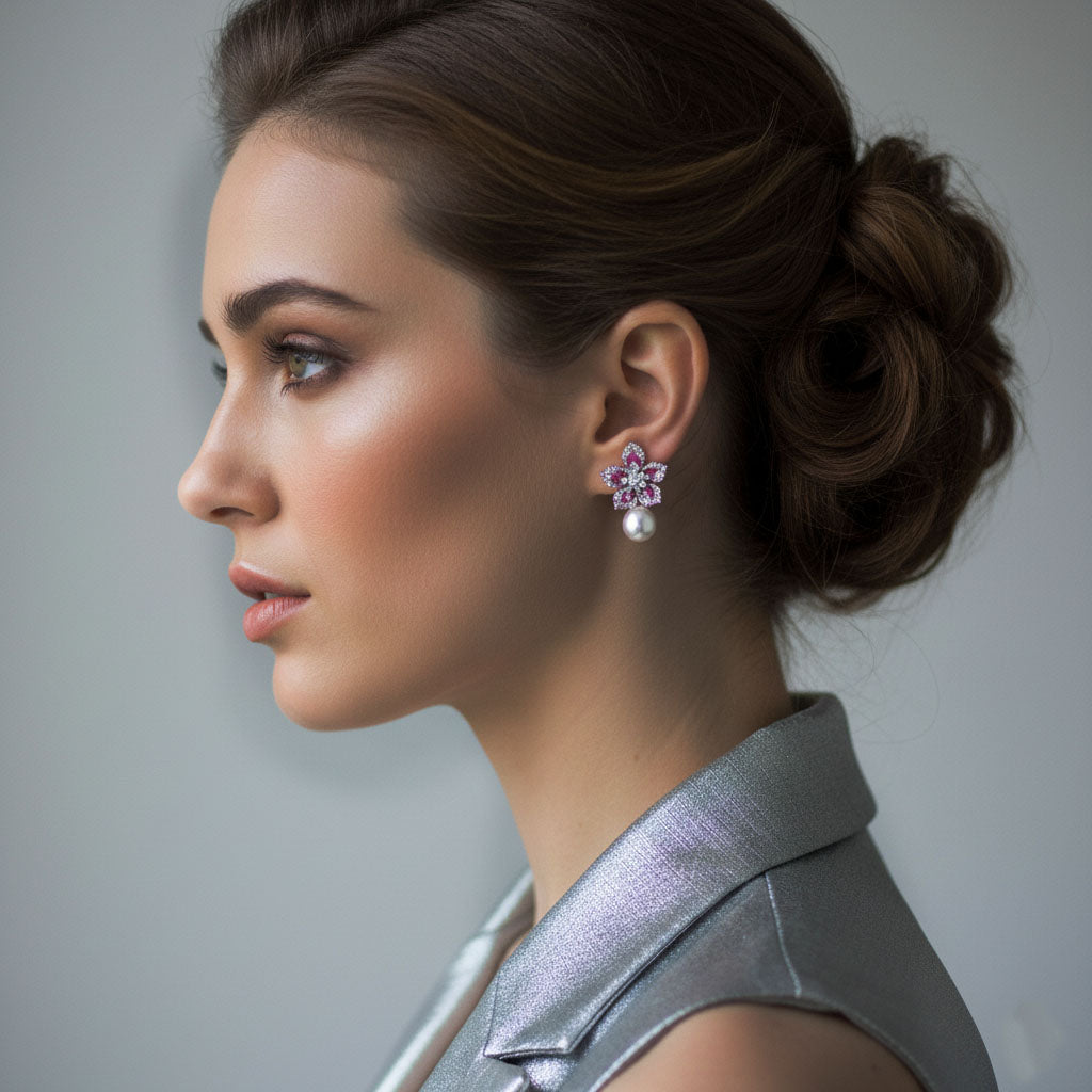 Elegant drop earrings featuring shiny pink and red cubic zirconia with a simulated pearl
