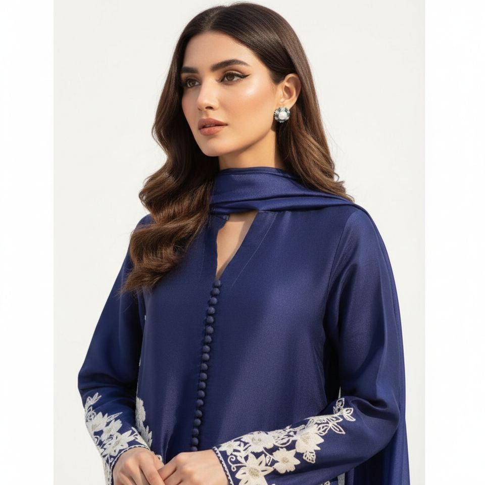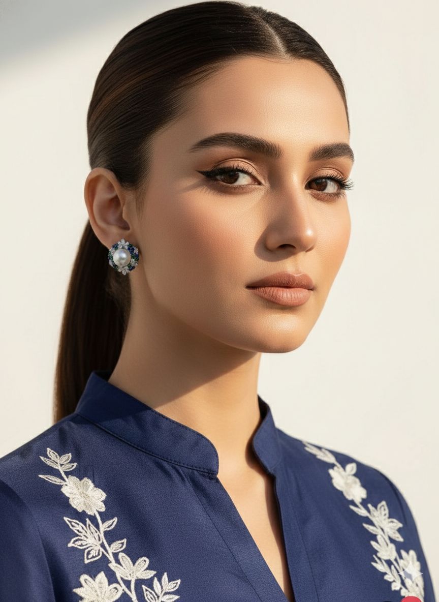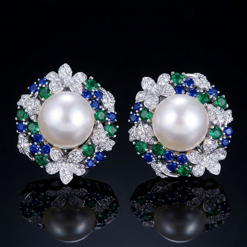 Elegant blue and white cubic zirconia earrings, featuring a flower cluster design with imitation pearls
